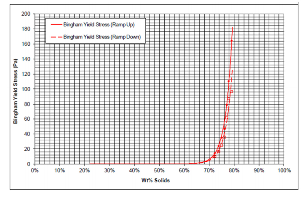 Tails are considered to have a Newtonian behavior up to approximately 68% solids concentration by weight, above this value their behavior is non-Newtonian, generally modeling as Bingham plastic. This can be seen in the green background graph (for copper tailings and for gold tailings in the white background chart) where for Cp values lower than 68%, the measured properties show negligible