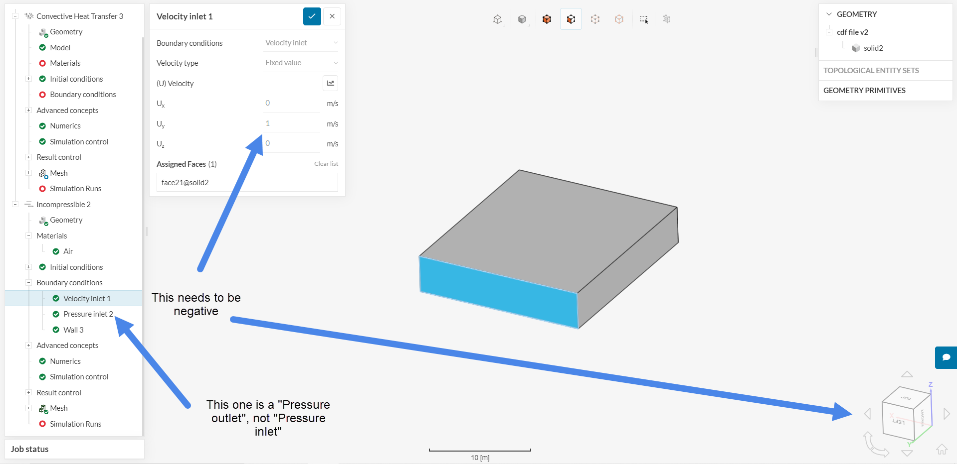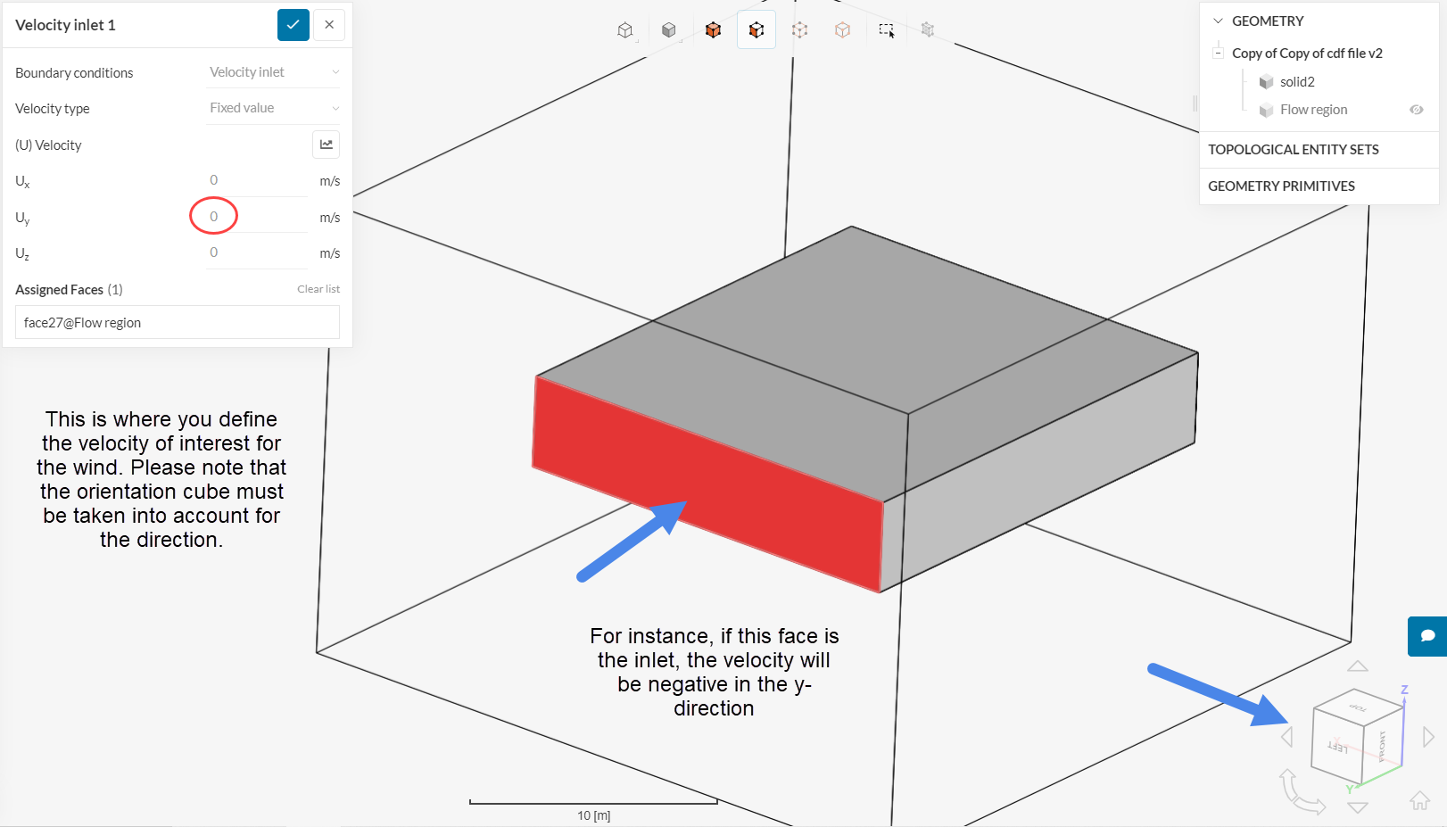 Also note that the velocity should be in the negative y-direction, to act as an inlet. So it’s -1, and not 1.