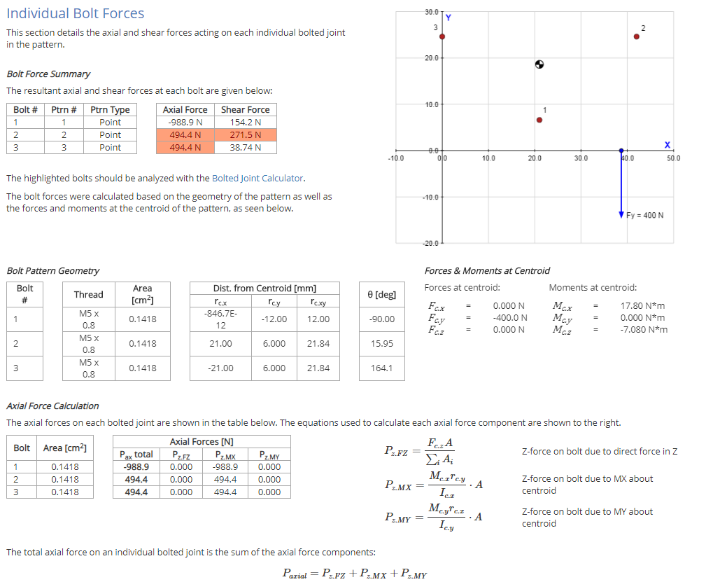 I tried a simplified version of your model, adding a frame and screws. As I expected the axial force on all three screws is out of the frame, not inwards for screw 1 as the website you linked to appears to suggest. The idea of using the centroid of the bolt pattern sort of makes sense but intuitively the hinge will rotate on its lower edge (and the simulation shows that’s a point of stress on the frame) and as long as the hinge plate is stiff enough there won’t be a moment around the centroid (IMHO).