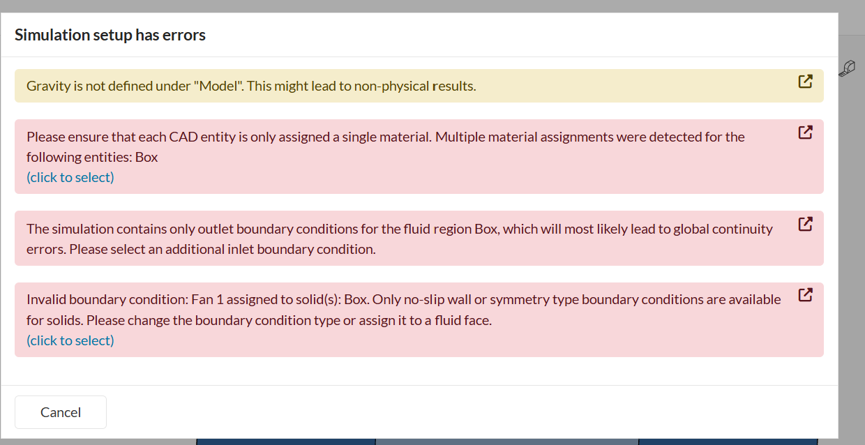 I also tried simplifying the model by using one solid box for the entire dryer, but that leads to other setup errors (see screenshot).