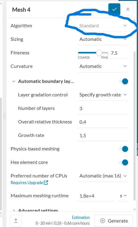 I have made a case in the solver Conjugate Heat Transfer v2.0. I want to make a mesh with hex-dominant algorithm but I can’t change it: