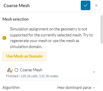 To run a simulation, you’d need to click the option “use Mesh as domain”, since the boundary conditions will be applied directly on the mesh for the Hex Dominant Parametric option.