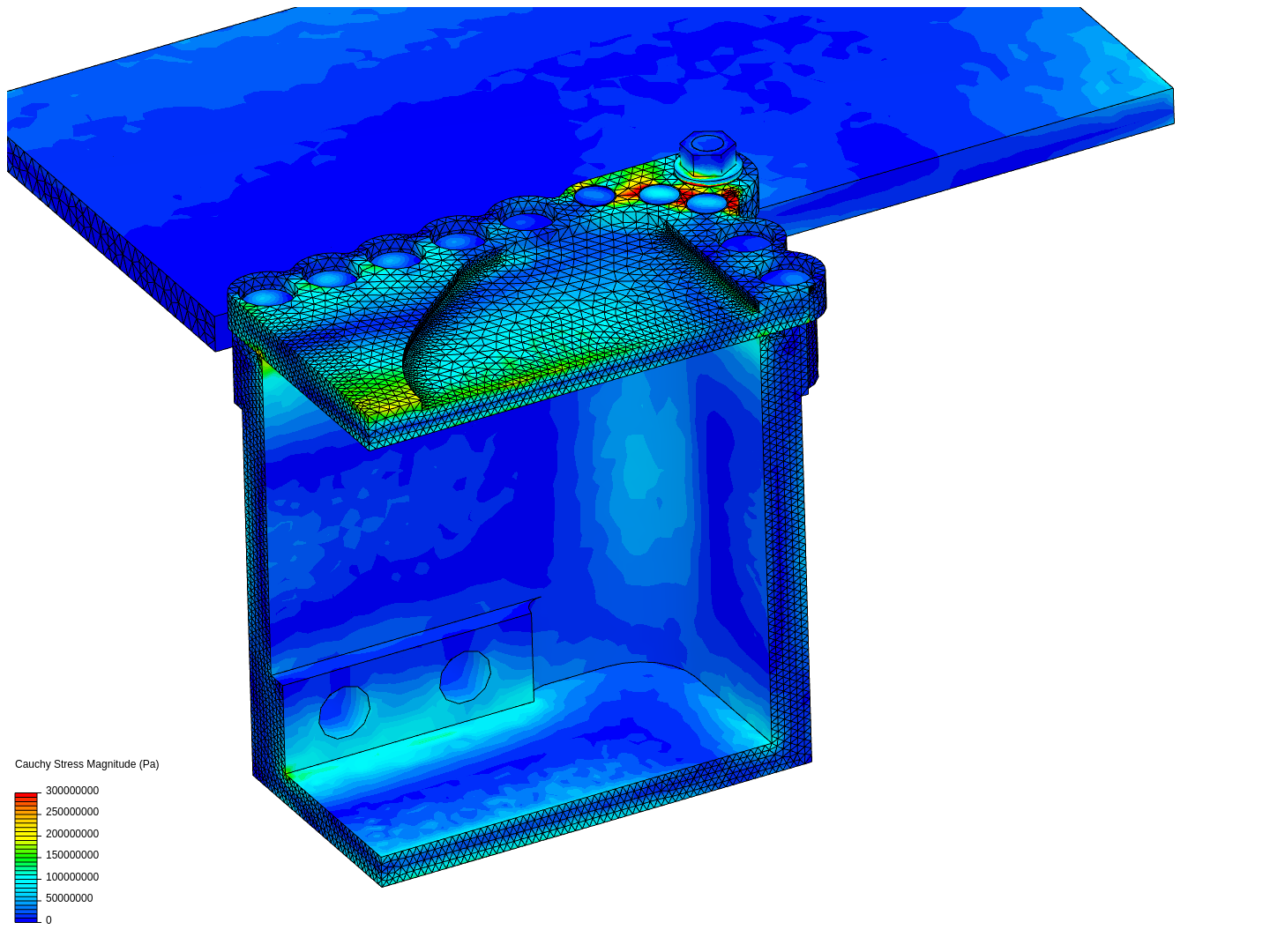 I have run simulations on a pressure hull model with face sealing. The goal is to test if the design can tolerate a given pressure magnitude. The hull is symmetrical about 2 planes, so just a quarter of it is represented.