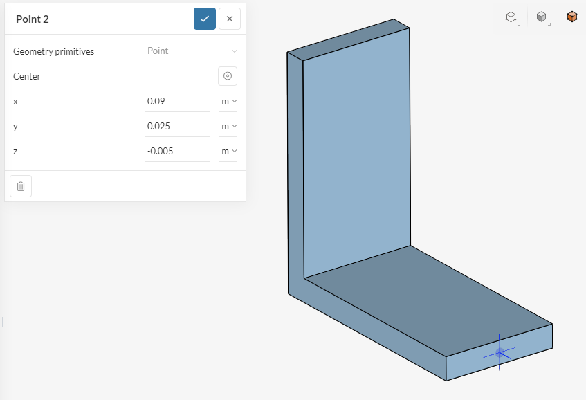 A very important aspect of a convergence study is to compare the results of different meshes at the exact same location. For this, we create a couple of result control items to retrieve the von Mises stress at the root of the corner (Point 1) and the displacement at the end face where the load is applied (Point 2).