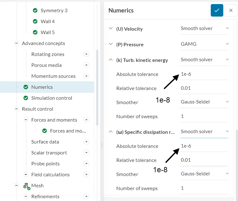 - For external aerodynamics cases, it’s always a good idea to lower the absolute tolerance of the turbulence solvers. The residuals from the turbulence parameters tend to drop very quickly, and we should ensure that the solvers continue to iterate: