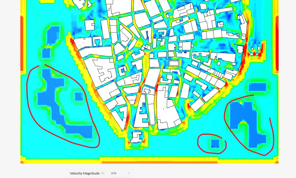 I want support in conducting pedestrian wind comfort assessment for a small city using incompressible flow. I need assistance in setting boundary conditions. My results when setting no-slip boundary condition show contrasting conditions compared to the surrounding in the open areas with no elements (in places outside of the city environment). What could be the explanation for this?