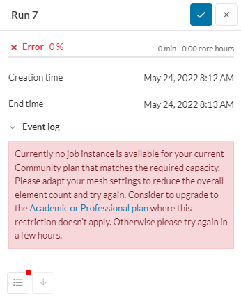 I’ve been able to commence my Simulation which has 5.2 million cells for 500s and its 35% completed, so I think you may be able to start your simulation thanks to Simscale and the freeing up of sever computing for the free community licence.