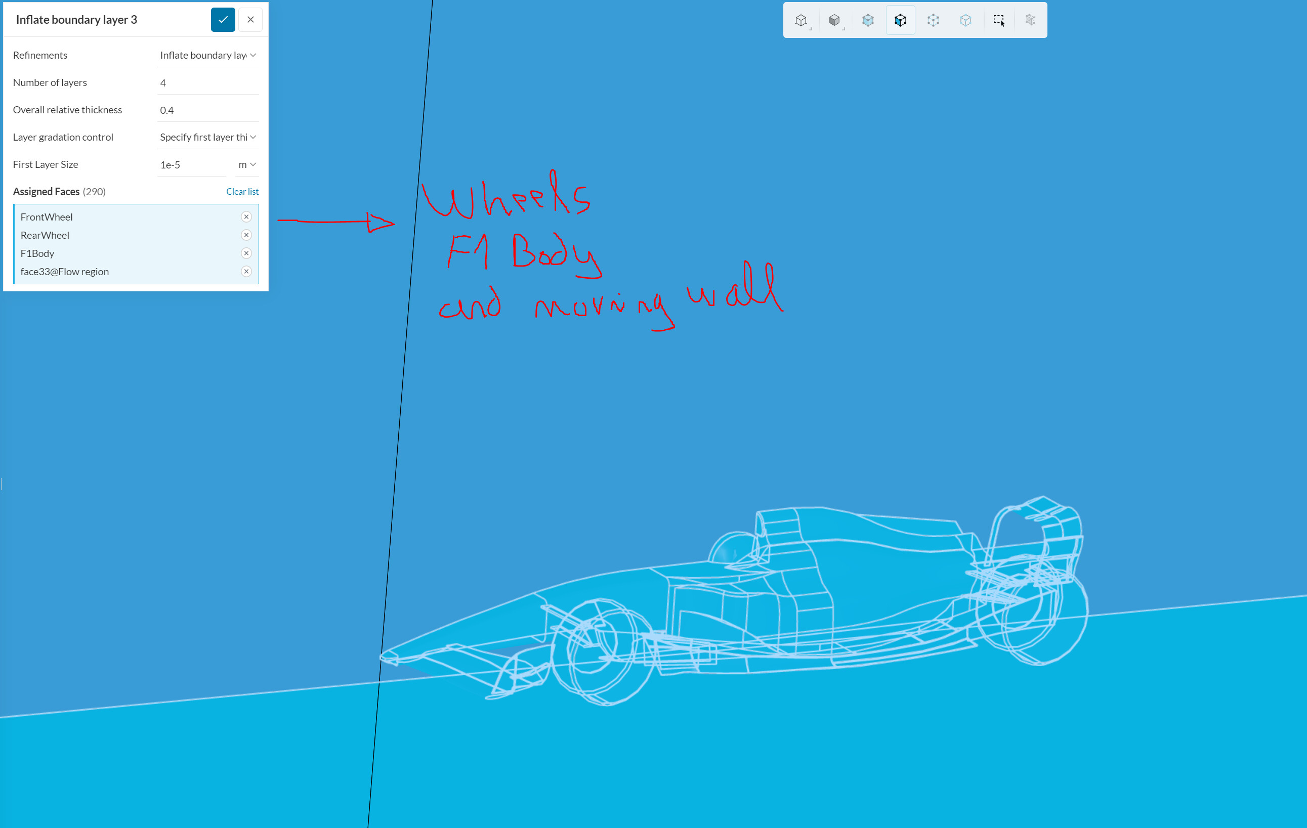 For the next simulation I decided to put different inflation values according to the areas with the higher y+. For the wheels, front wing, wheel struts, side pots, moving wall and underfloor I used the same inflation settings with a thickness of 5x10-6 m, for the rest of the car 7x10-6 m.