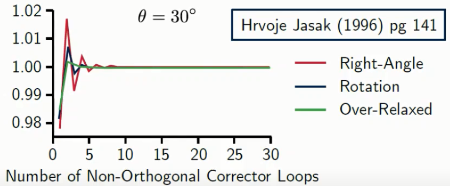 The most common of these methods is the Over-relaxation method, due to the smaller amount of Non-Orthogonal corretor loops needed for a converged result as shown in the picture below. Since we now know that the value for the Explicit term n2 is taken from the previous iteration (source term), this value lags behind the solution for the Implicit term n1. Therefore, we are required to loop through iterations and update the n2 value, in order to get a converged solution for that Non-orthogonal cell.