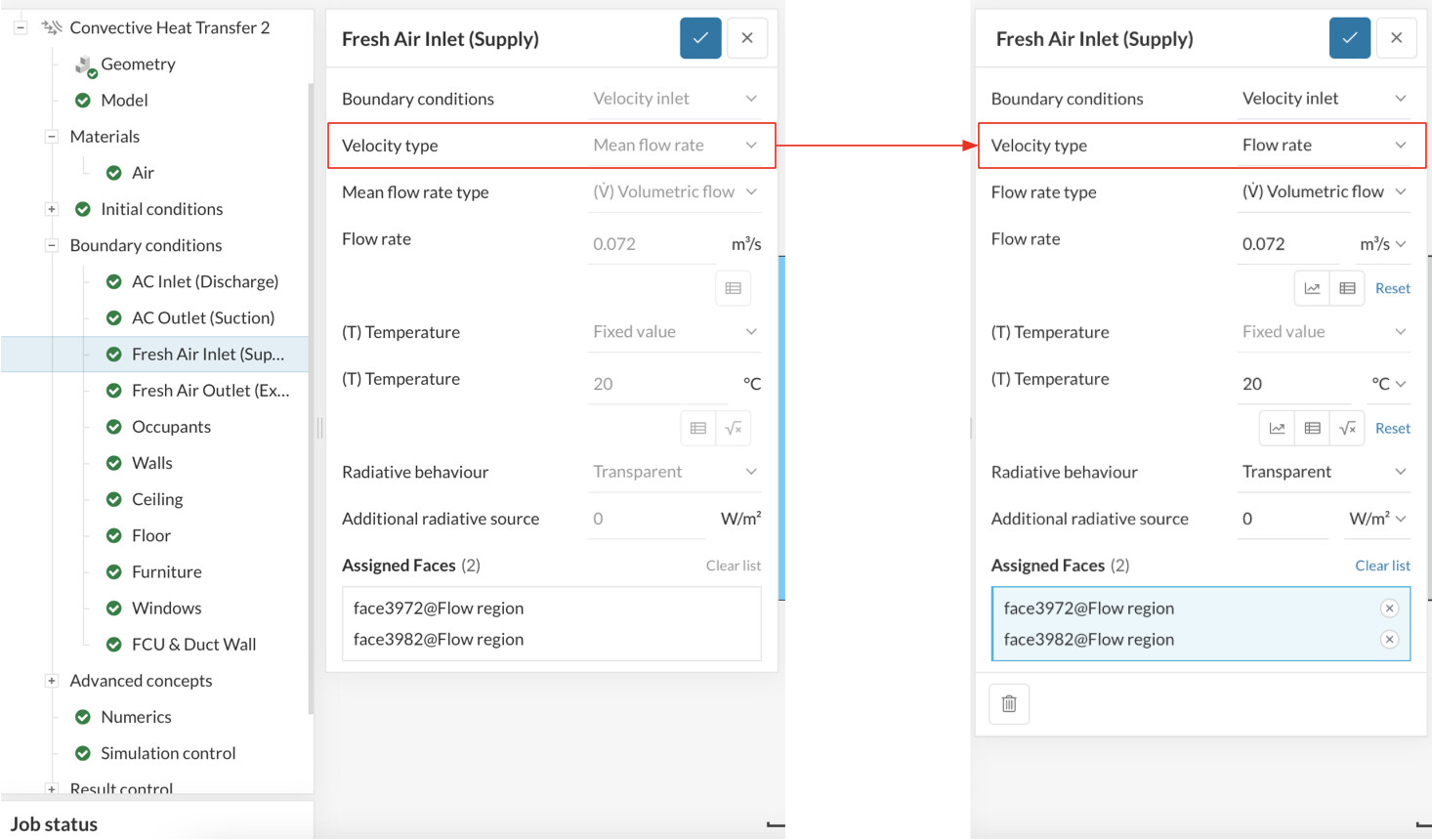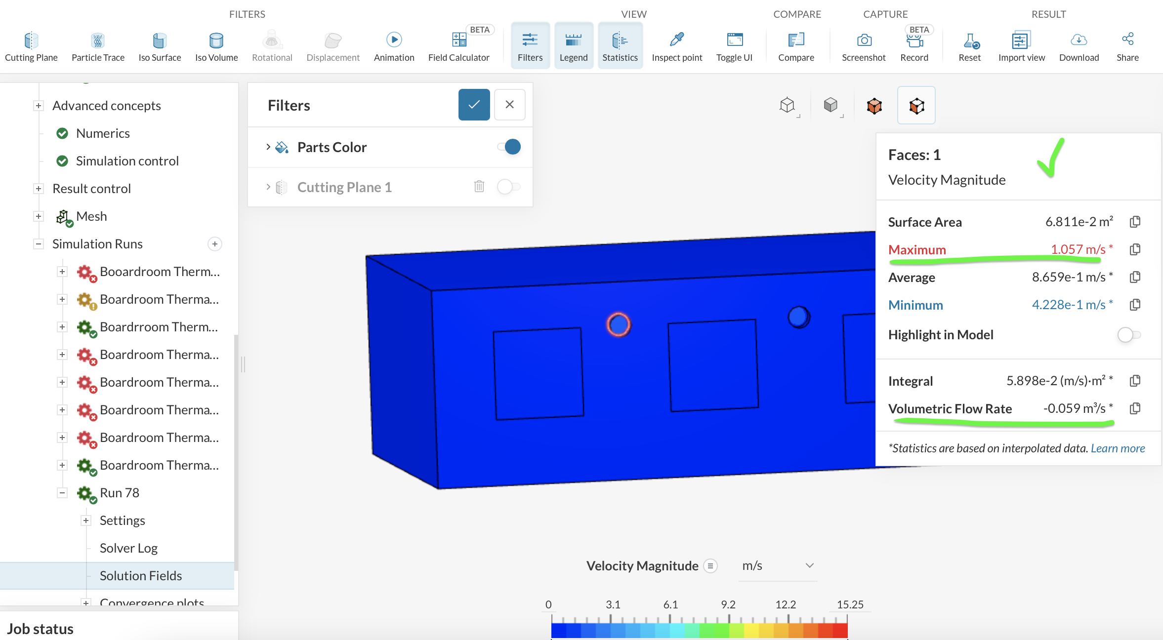 I am getting one anomalous reading from one of the velocity outlet boundary condition (Fresh Air Outlet (Extract)). This was set to 0.072m3/s for a 150mm duct and results are showing velocity vectors of up to 30m/s which does not seem correct: