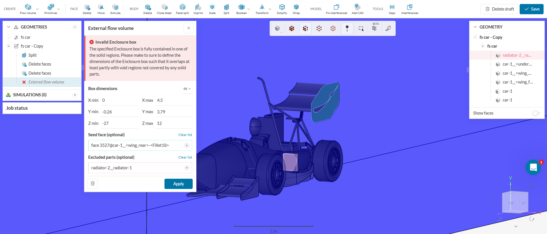 In section 1.1, it asks us to edit a copy of our CAD to create an external flow volume. I’m not using the model they have provided, and am instead using a custom model. I’ve already tried to simplify it as much as possible, however while generating the external flow volume I get the following error message: