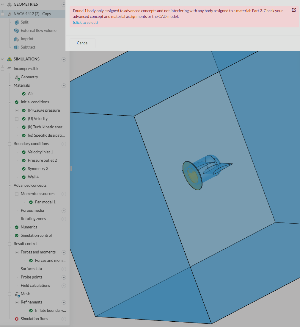 My momentum source (Fan model 1) isn’t working because SimScale can’t detect proper interference between Part 3 (my actuator disk) and the flow region. For momentum sources to function, the actuator disk must physically overlap or intersect with the flow region as separate bodies - this interference is how SimScale applies the momentum effect within the domain. The error “Found 1 body only assigned to advanced concepts and not interfering with any body assigned to a material” means Part 3 appears geometrically isolated from your flow region, even though it looks positioned correctly in your 3D view. This is typically a geometry detection issue where the overlap isn’t being recognized properly by the meshing algorithm.