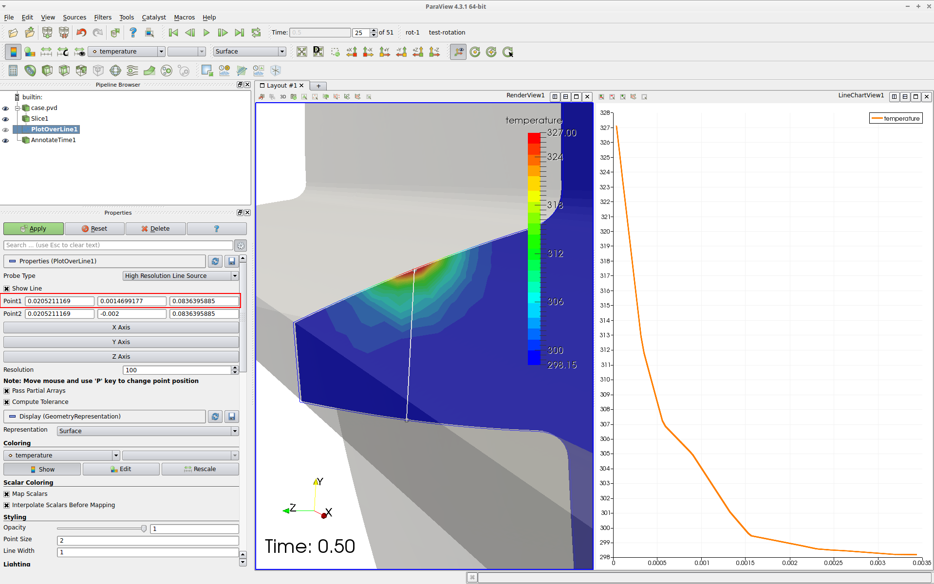 Below is the figure taken in local Paraview in which slice and plot over line filters were used in order to get temperature plot so that the depth of laser can be measured. The red highlighted coordinates are of middle point which are also used to make a slice.