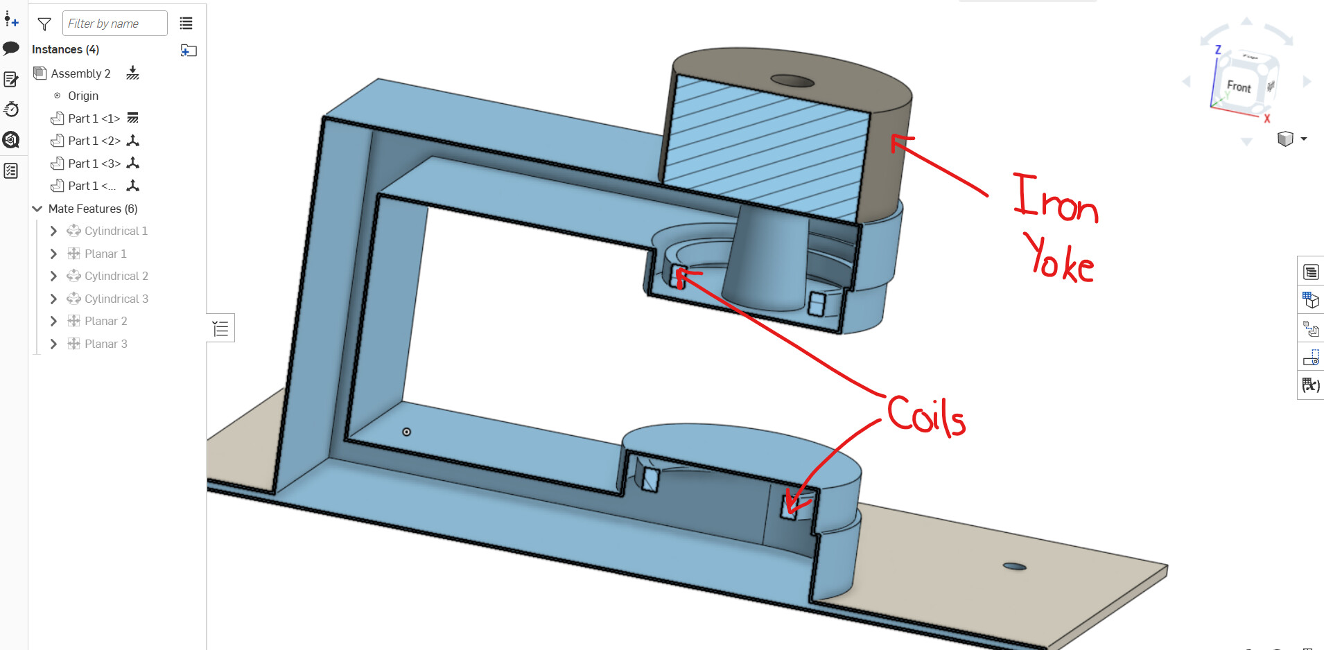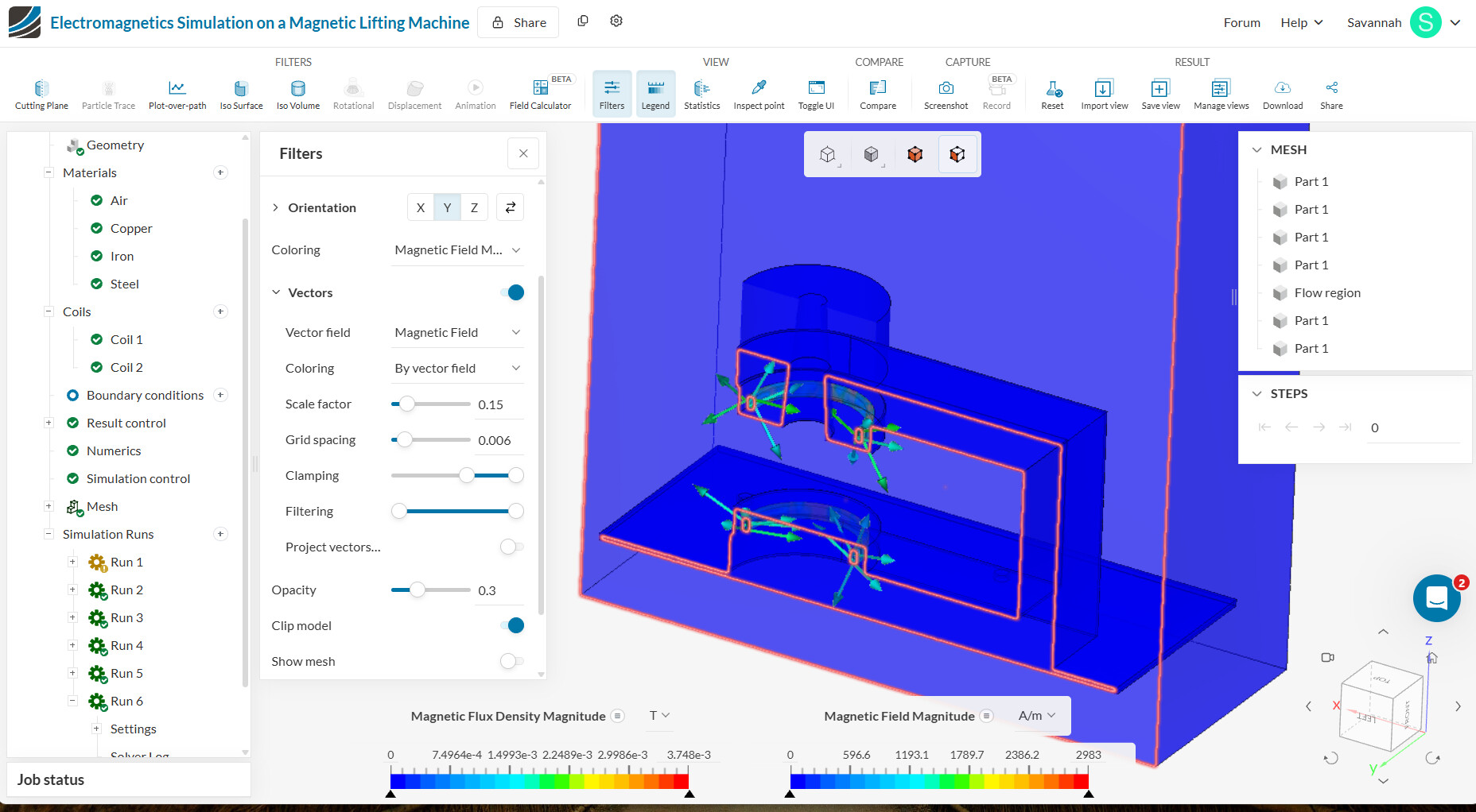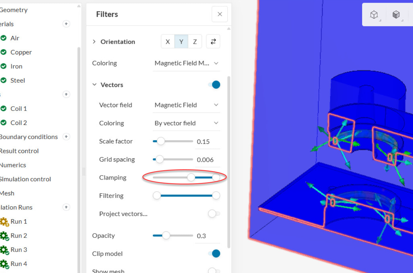 I am attempting to simulate the magnetic vector field of a C-shaped split bore MRI design with an iron yoke for magnetic shielding. Each bore of the MRI (one top bore and one bottom) has a current coil for the simulation. My primary goal is to see how magnetic field lines from the MRI are deflected through the iron yoke (giant gray top donut).