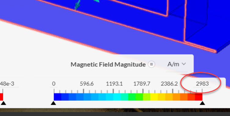 Here’s a quick thing that you can do to check if there is a magnetic field developing in the flow region: adjust the upper bound of the legend to a low-ish value (e.g. 1) to see if the flow region remains blue.