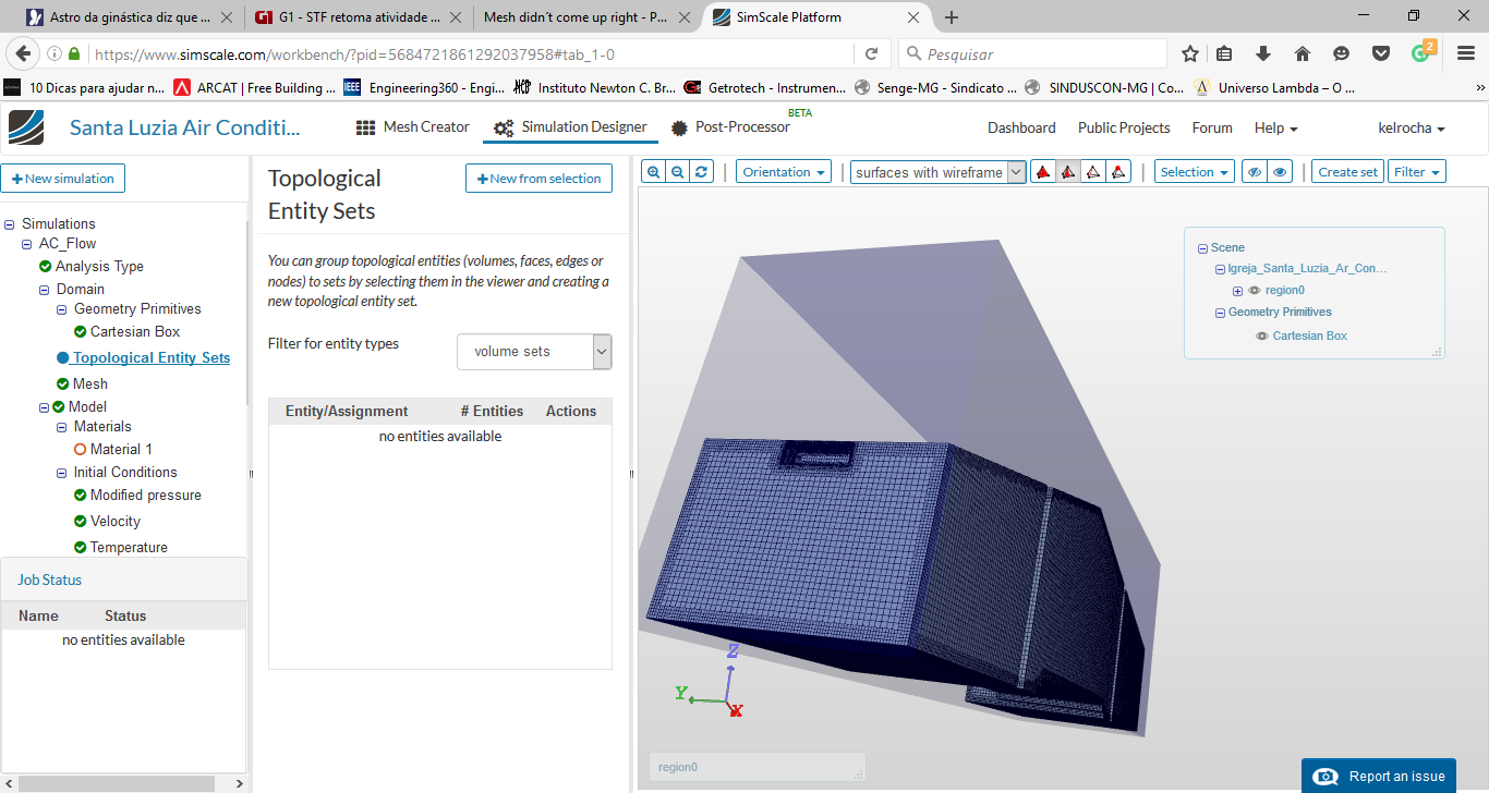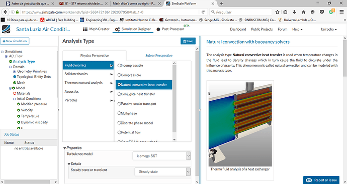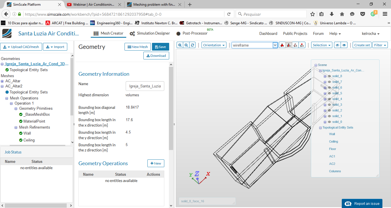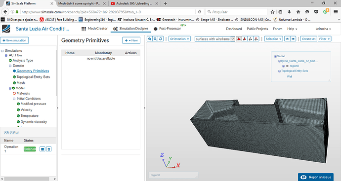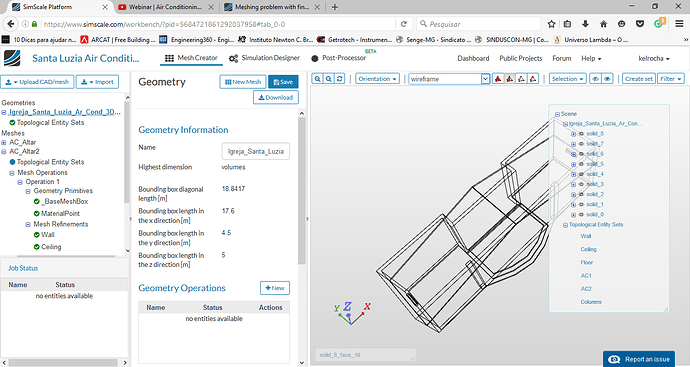 After that, I think you have the right approach regarding the mesh type but you have to personalize it a little better. When you click on “Operation 1” you will see properties, the number of cells needs to be increased and probably like that there are other things that need to be personalized. A trick that does this for you and I learned recently from @sjesu_rajendra is to select the geometry “Igreja…” in the geometries tab and then you should see on the top, next to “geometry” a button that says make new mesh. If you create your mesh this way, when you select hexahedra parametric and click save it should automatically fill stuff based on your geometry. After that make sure that your material point is occupying the volume of air and not any solid.