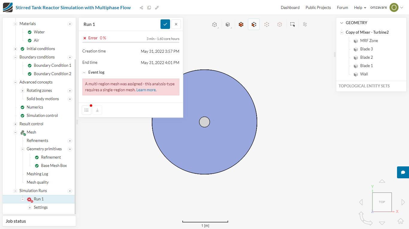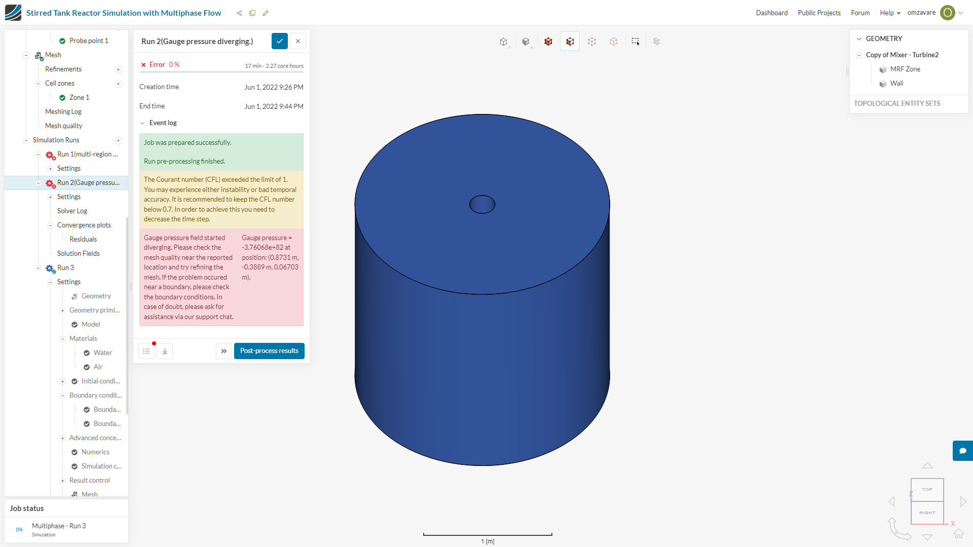 (2)Gauge pressure field started diverging. Please check the mesh quality near the reported location and try refining the mesh. If the problem occurred near a boundary, please check the boundary conditions. In case of doubt, please ask for assistance via our support chat. Gauge pressure = -3.76068e+82 at position: (0.8731 m, -0.3889 m, 0.06703 m).