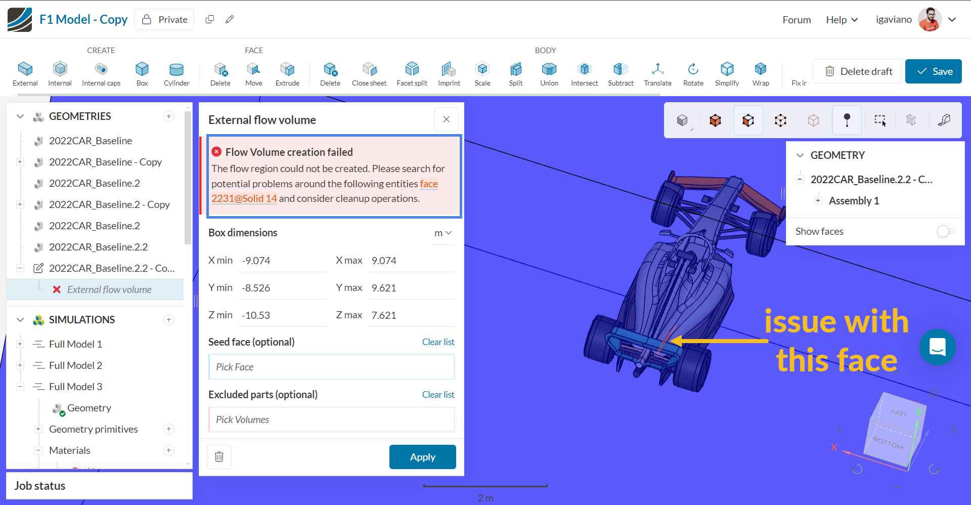 I am trying to run CFD on a model of F1 2022 spec car. The mesh does not generate specifying the issue as just “An error occurred”.
