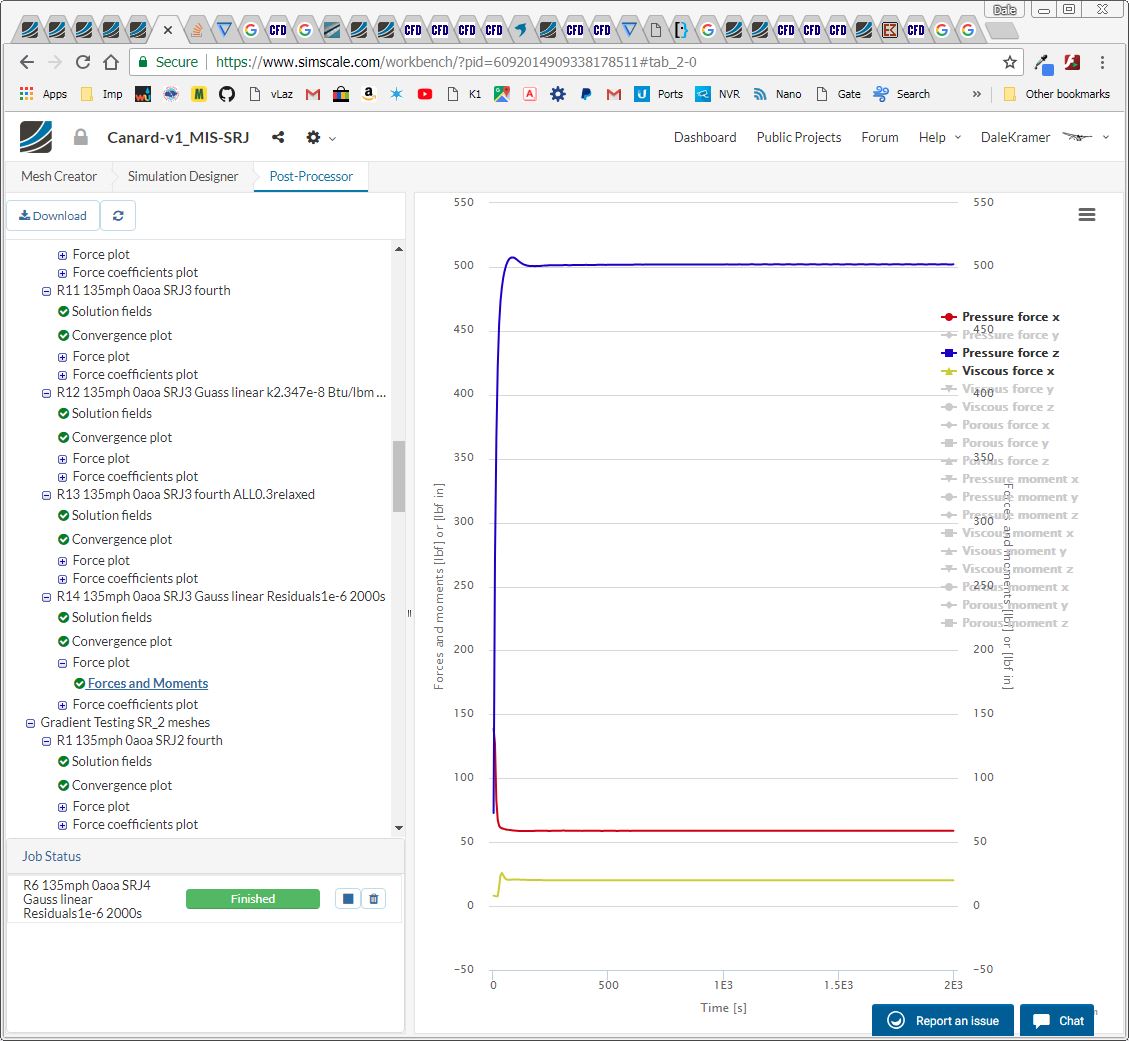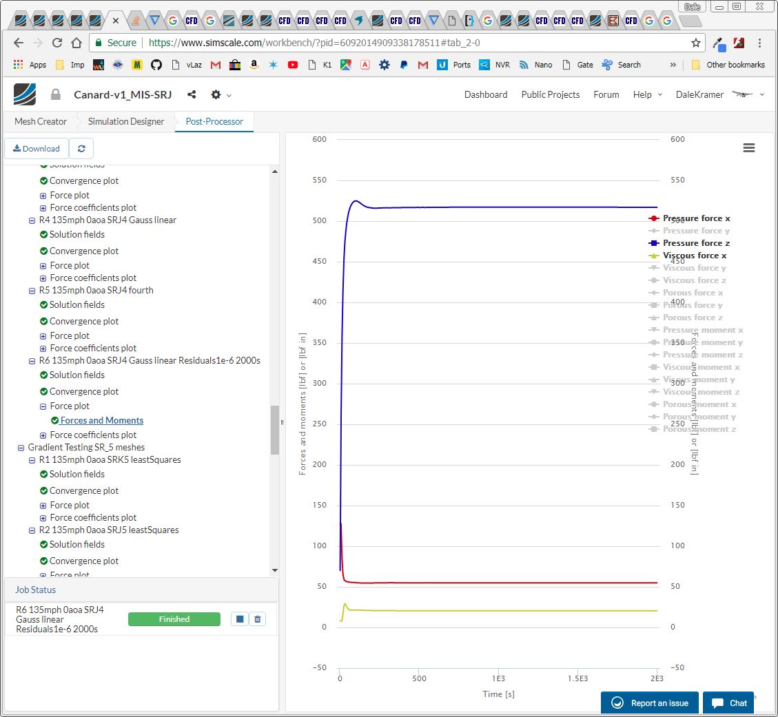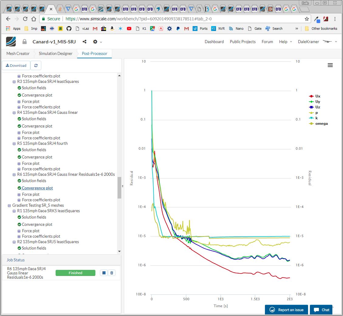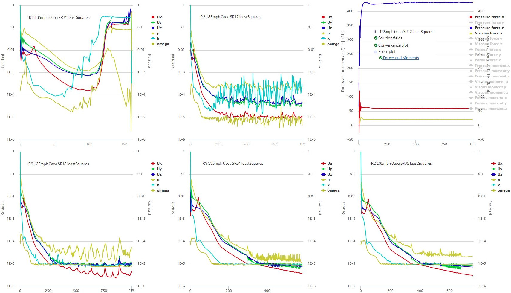 Thanks for the posts on the convergence plots. I will only consider those that have either converged or reached the simulation end time. Plots like the second figure top left (R1 1 35mph 0aoa SRJ1 leastsquares) and almost all of the fourth plots except the bottom left R5 134 mph 0aoa SRJ4 fourth) are diverged and the results obtained from those cannot be used. Further adjustment may be needed in the meshes or numerical parameters in order to try to get these plots to converge. We’ll work on them probably later as higher order schemes don’t seem to yield the result behavior we expect.