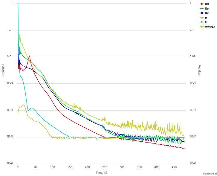 If you look at the plots that do converge, we see acceptable margins for convergence even for the residuals of Ux. The residual that does not converge as well tend to be the pressure (p, yellow) and this is usually due to the mesh and how the velocity interacts with the mesh itself from what I’ve experienced. However, some simulations do give good convergence for that value and the ones that don’ t converge as well are also of acceptable convergence.