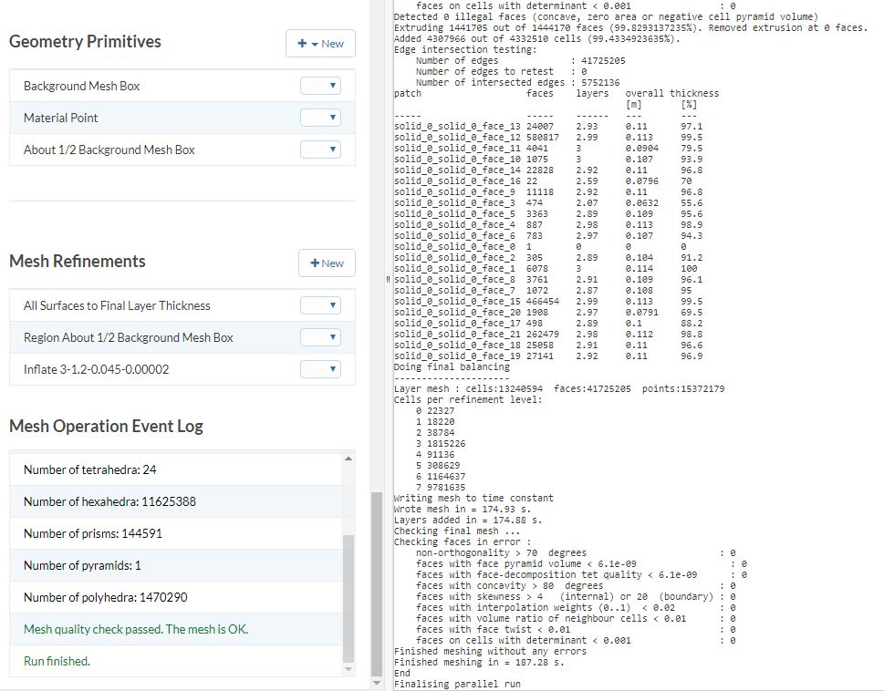 My geometry is refined as simply as I can think of with a Background Mesh Box generously sized (I think anyways ) . The method was, one region refinement encompassing the whole plane plus a few feet, one surface refinement on all surfaces to a single level (where Min level=Max level) close to the last layer thickness and then a 3 layer layering to a yPlus of 160.