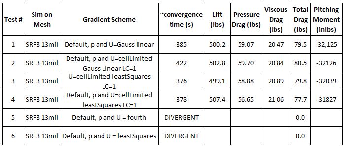 I will research what the SnappyHexMesh quality checker looks for and try to get ‘fourth’ and 'leastSquares’to converge and then see how those options handle my mesh in a full study spread. In addition, I will likely run a study spread on the already converging cellLimited leastSquares scheme (Test #4).