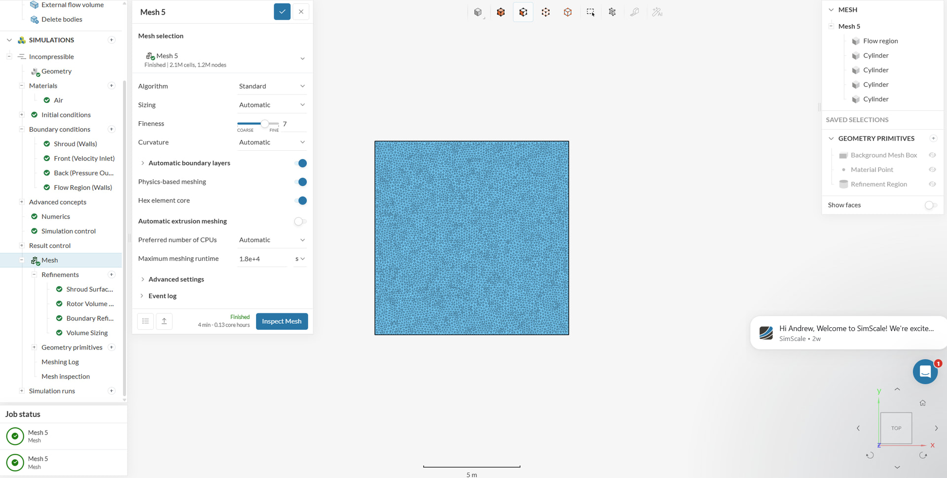 I am working on a drone shroud project where I want to simulate airflow through a manifold with 4 outlets which are the drone rotors, and 1 air inlet where I will measure suction. I followed the simscale tutorial for preparing a rotating bodies simulation, so I think it is setup correctly