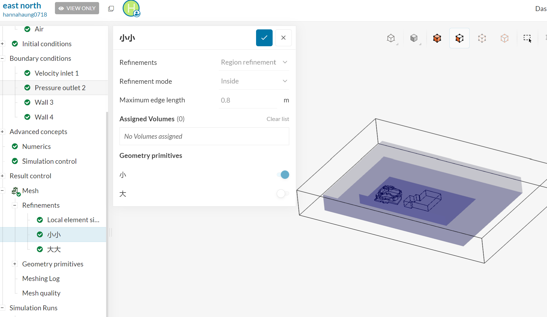 I just noticed this Simulation that is current underway, somewhat similar to your project, but wind is coming from east/north. Its a very large 15.4million cell simulation, but you can see its a large area & 2 regional refinements have been created. Interesting to see the parameters, note the ground plane settings in this model, as in real life and in accordance with wind codes wall (ground surface) friction impedes wind velocity close to the surface.