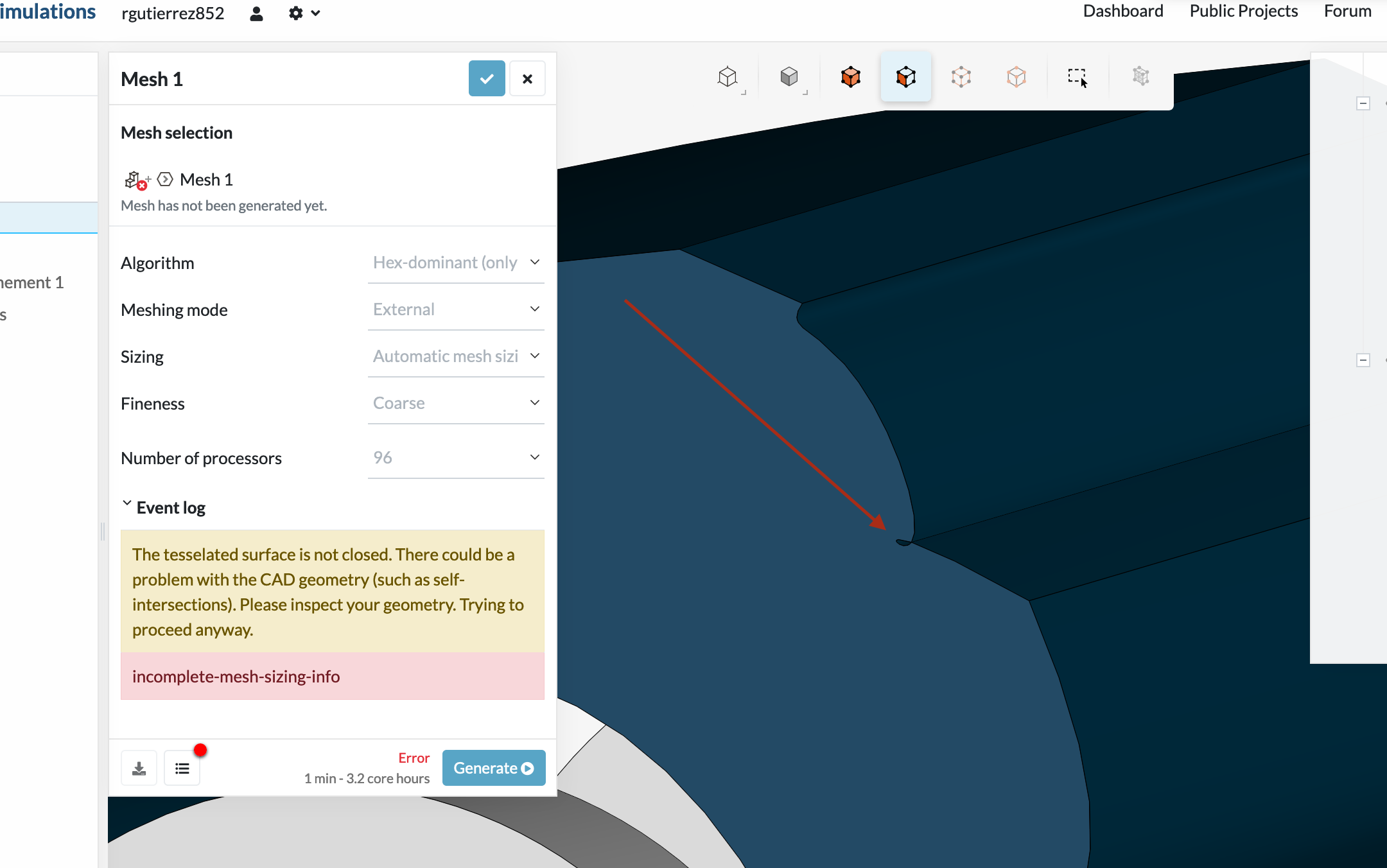“the tesselated surface is not closed. There could be a problem with the CAD geometry (such as self-intersections). Please inspect your geometry. Trying to proceed anyway.