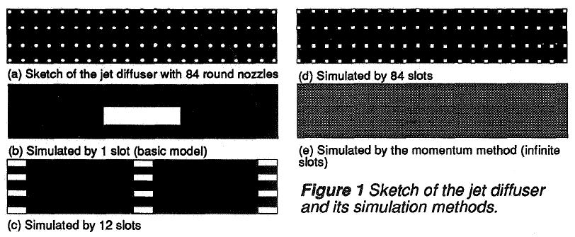 Since the geometry of diffusor cant be modelled directly (unpractical) simplification are been made. One of these simplification is called the momentum method, described here: iea.org. In this paper a jet diffusor with 84 round nozzles (picture below (a)) is in different methods simulated (b,c,d,e) and the results with measurements compared.