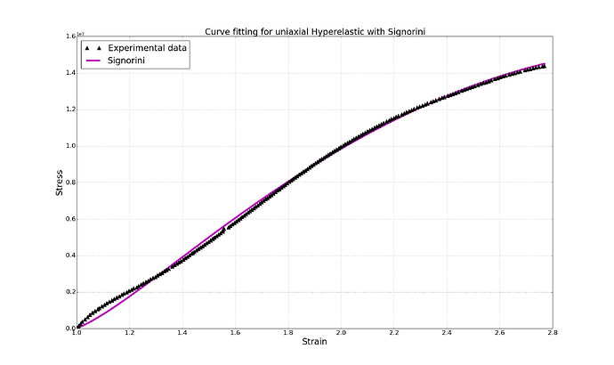 I would prefer to use Signorini as the fit is quite accurate, may be not for lower strains but later for higher strains. Please also ignore the added 1 in strain values. This is normally done in order to get the results at zero or low strain. Please see Hyperelastic material documentation for more info.