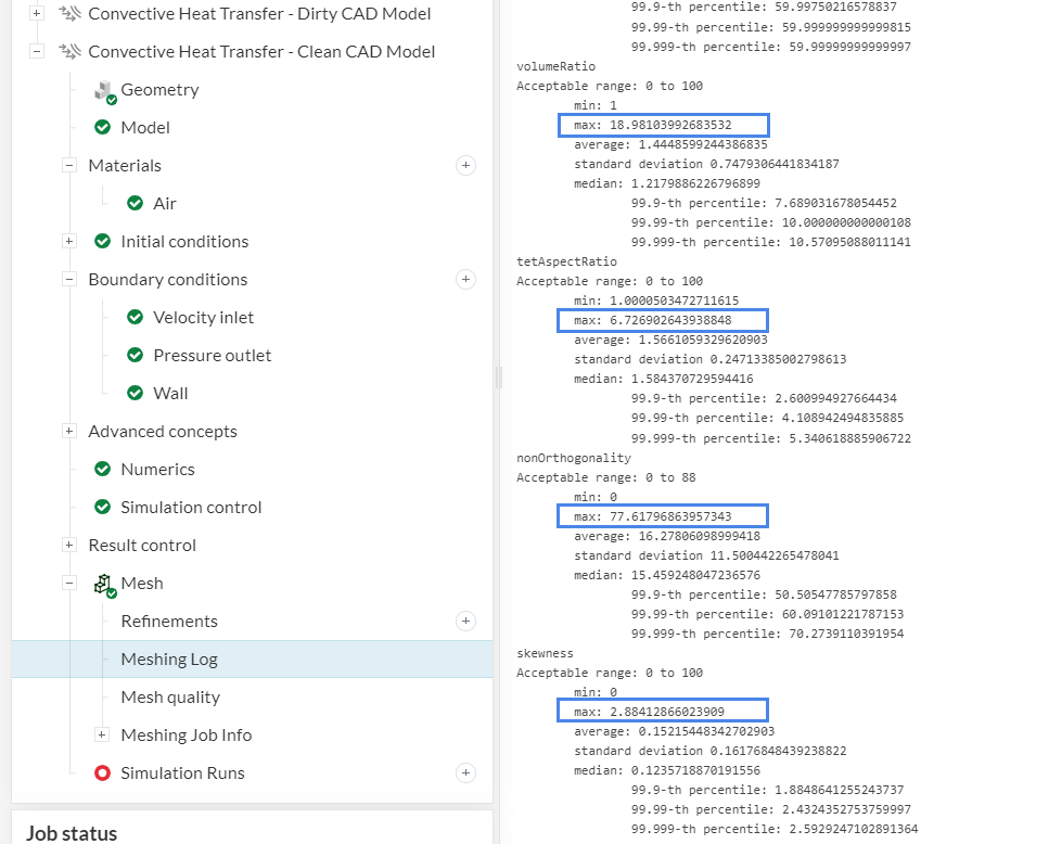 For demonstration and comparison purposes, both meshes use default settings. First, a quick comparison of the mesh quality metrics. Here are the metrics from the dirty CAD: