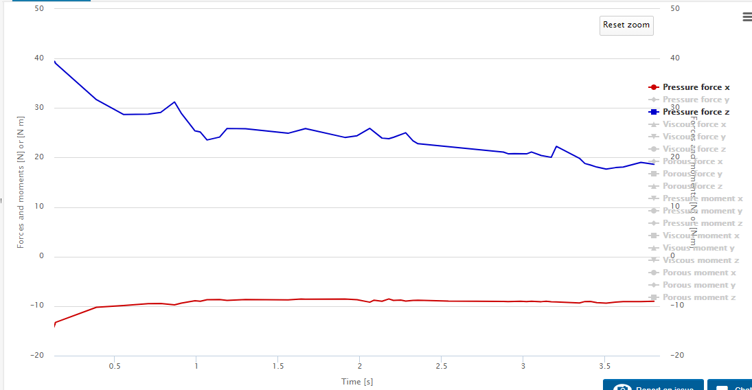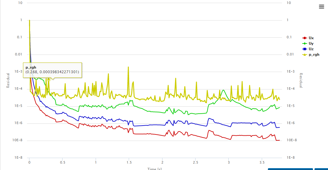 I created a new model with a different co-ordinate system so that the outlet velocity is a positive value when defined. I dont know if that made a difference because I found that in common with similar projects here. Look under ‘Ver12.5Test2’ - https://www.simscale.com/workbench/?pid=961853807733457623#tab_1-0 . Ran a case with a time step of 0.005, the residual monitor and force plots were stable for 12 secs free of any cfl issues until there was a sudden spike in the residuals and the sim crashed throwing a fatal i/o error. When I looked under the solution fields there was no backflow which could have caused this. Either way I am running another case with a bigger time step. The residuals and force monitors do look promising as shown below. I will keep you posted. Cheers.