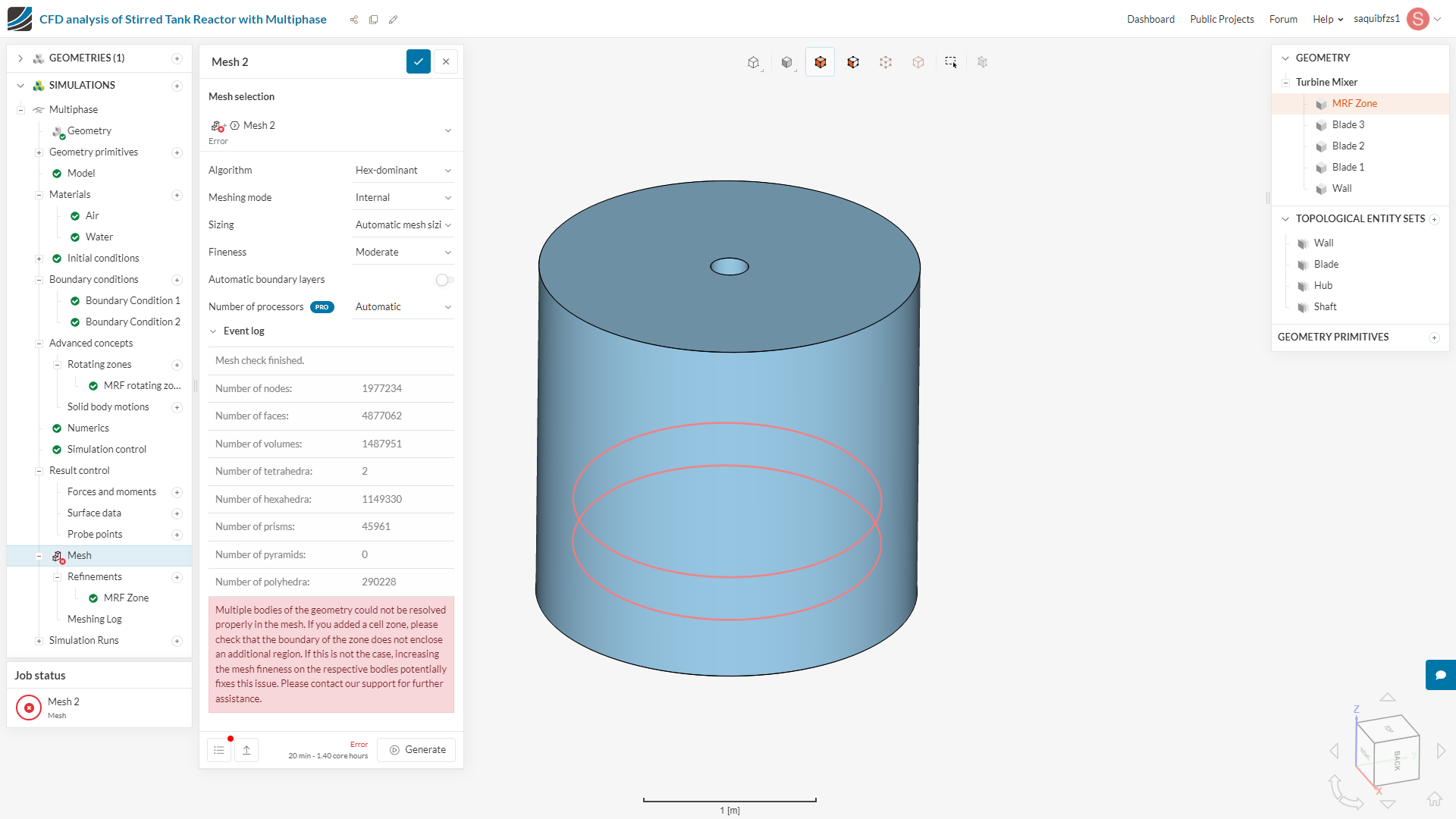 Multiple bodies of the geometry could not be resolved properly in the mesh. If you added a cell zone, please check that the boundary of the zone does not enclose an additional region. If this is not the case, increasing the mesh fineness on the respective bodies potentially fixes this issue. Please contact our support for further assistance.