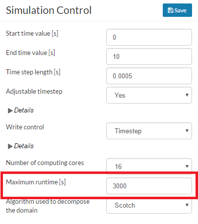 Thanks for sharing your question in the forum. With SimScale, you have a default maximum execution time (set at 3000 s here). What this means is that after 3000 seconds, ~50 minutes your simulation will be cancelled. We have this setting to ensure that you do not burn through all of your core hours on a simulation that is for example not converging.