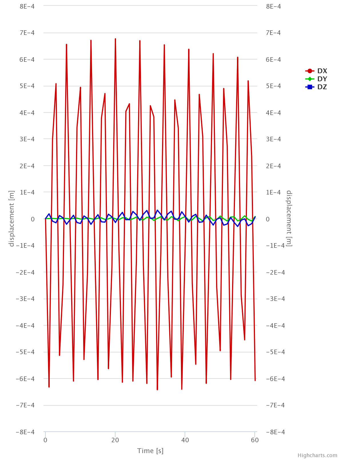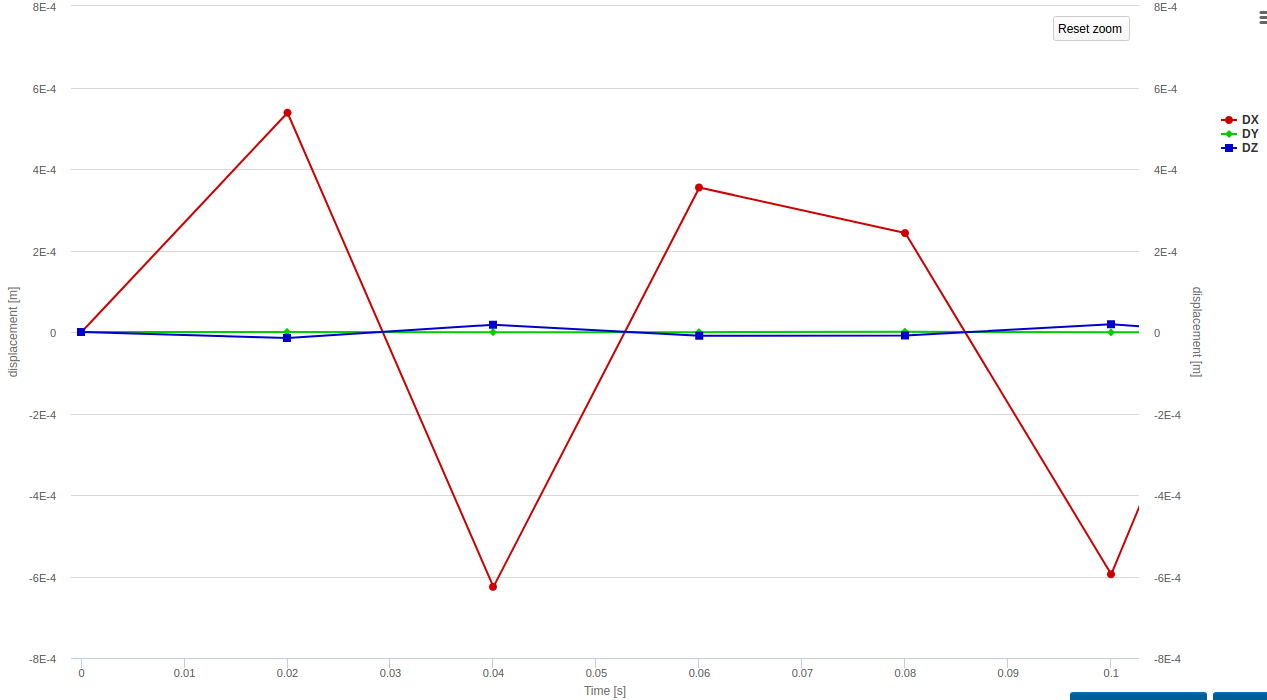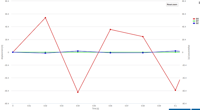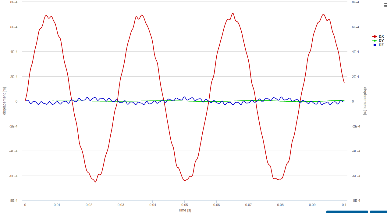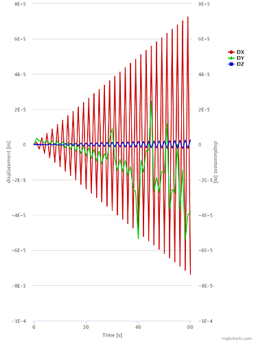 The forces on each of the support areas is also calculated, which is really useful for final design of strings and drivers. There’s something on SimScale site about ‘pretty pictures’, and it is really important to look carefully at what the pictures say to determine what you learn from them. For example, the displacement graphs above implied that the oscillation just keeps getting bigger (over 60 seconds anyway), and that just did not seem sensible (at least in this scenario). So, that’s when I tried other options in analysing this situation. It is indeed unfortunate for me that none of the other dynamic analysis tools (modal, frequency and harmonic) accept the remote displacement boundary condition, so I might need to come up with another physical arrangement to simulate the strings support.