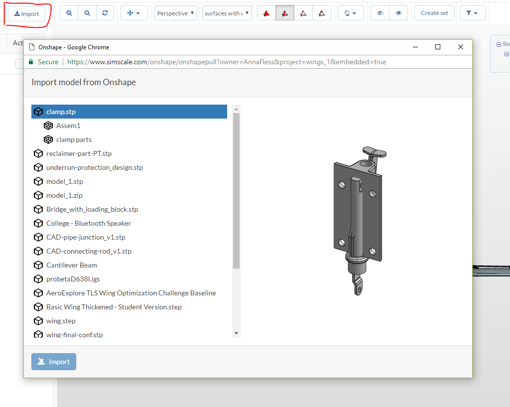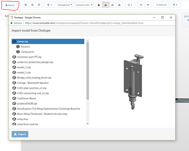 After you authorize the app, you will be able to see all your Onshape existing models. Import the model or part you want to analyze with SimScale by selecting it and clicking on the import button.