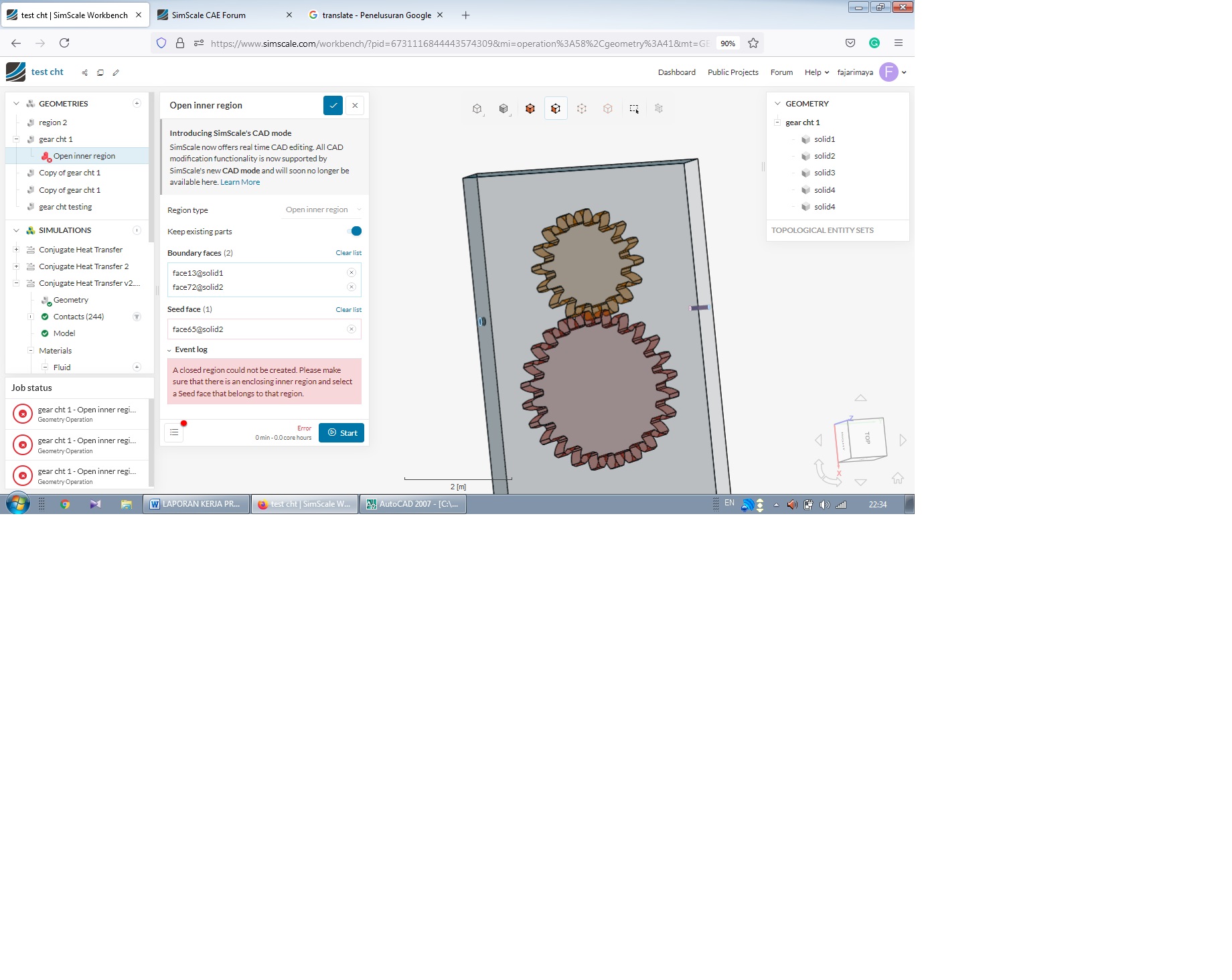 hello, I want to model the CHT analysis, I have studied how to create an open inner region and it always fails, I have difficulty in the Open inner region for the 3-D geometry of rotorcraft gears that I want to simulate. can you help me with this problem?