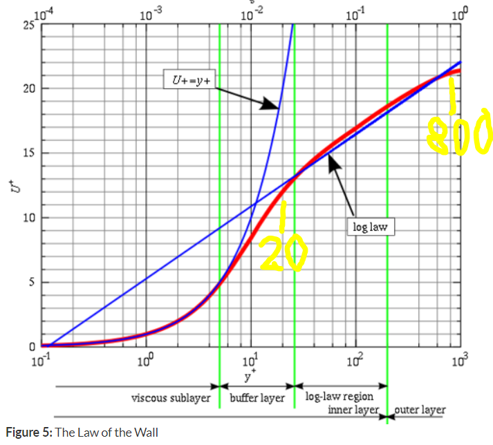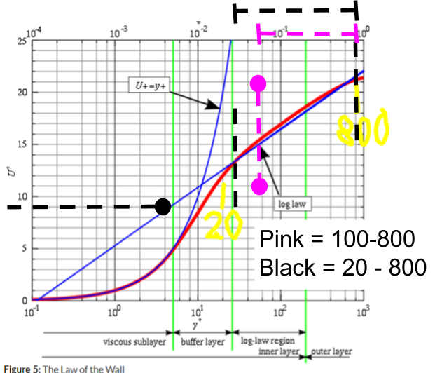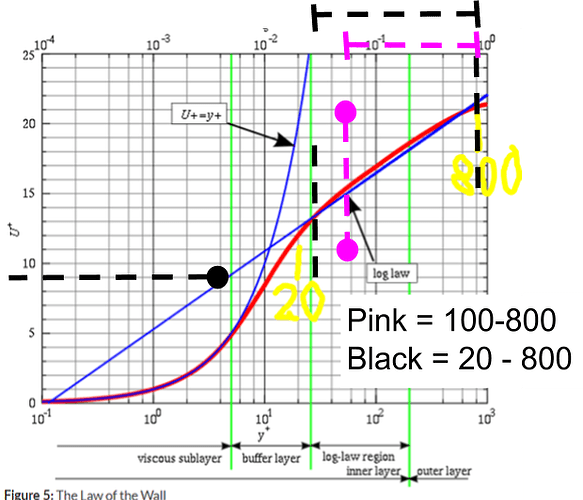 Looking at this plot and if the red line truly represents the value we try to achieve, then I see little difference in the log law straight blue line ‘calculation error’ from the red line, for y+ 800 and y+20, do you