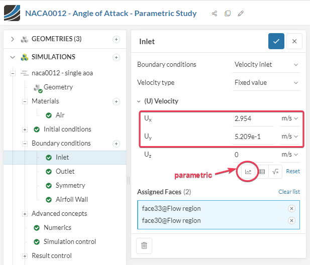 Now, assuming that you are interested in a greater range, you can setup the parametric study by simply clicking the corresponding button as shown above. You will then get the chance to fill in multiple variations of the velocity components to depict the required angle of attack range. To speed up the process you can even upload them via a csv file.