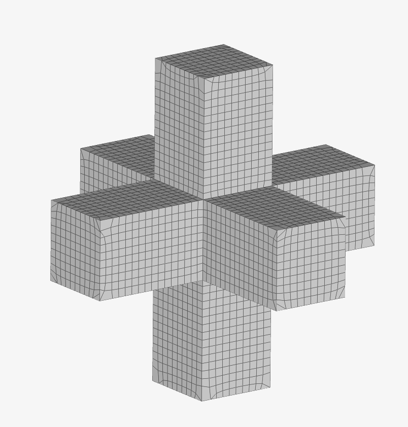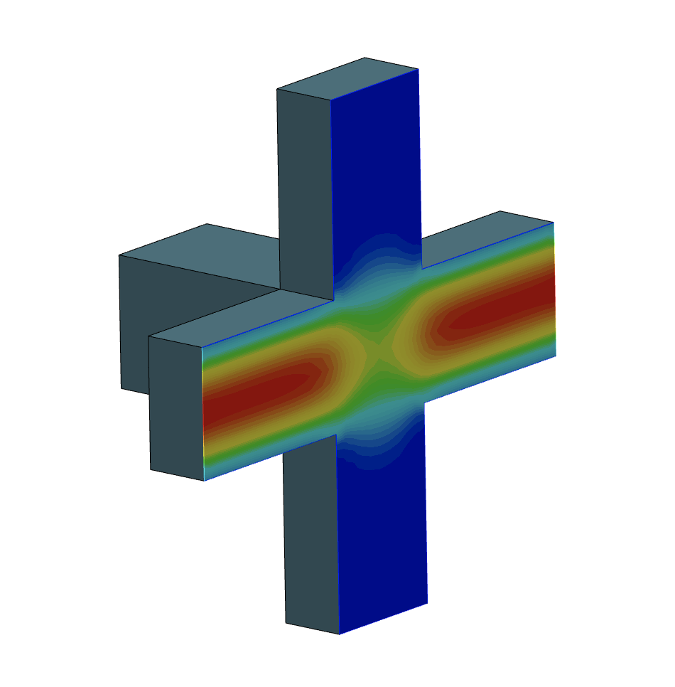I am trying to run a case where all sides have periodic boundary conditions and flow is driven by a momentum source. This is modeling a unit cell of some porous media. Very low Reynolds number, laminar, incompressible, steady-state. I’m having some difficulty with running cases with more complicated geometries, I’m guessing due to mesh issues. I started with a simple case of some connected rectangular channels, in the image below. Opposing faces of the channels have periodic boundary conditions, so there’s 3 pairs of periodic BCs. I ran the case with a momentum source in 1 direction, and got reasonable results, the velocity magnitude field is below.