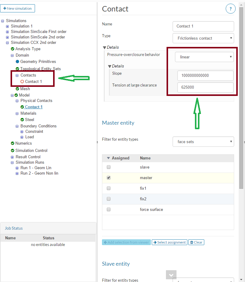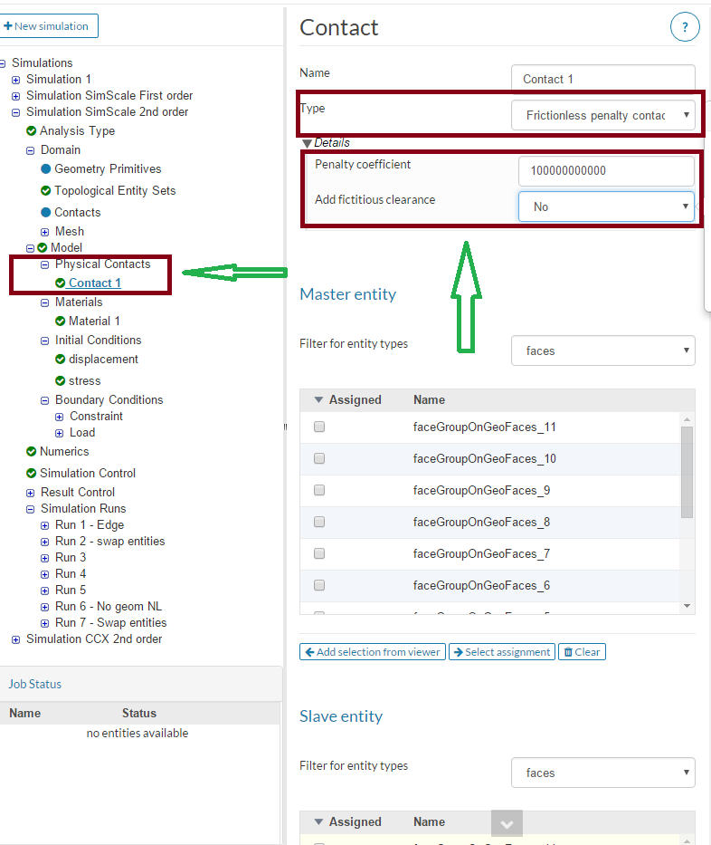 We suggest the user to use Penalty method for CodeAster and Linear for Calculix in order to get the first results. Especially when dealing with 2nd order mesh Calculix is much faster than CodeAster. The only tricky part is to set the parameters for the contact. For Calculix the optimum parameters are as shown in the figure below: