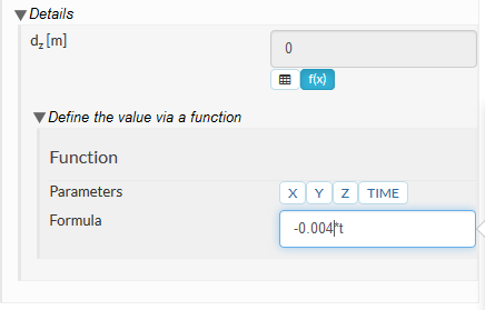 Example: -0.0036t means that at the last time step (which is 1) the displacement “condition” in z-direction of -0.0036[m] will be fulfilled starting at 0 displacement at the initial time t=0. In the next step you will have -0.00360.05[m] and so on.