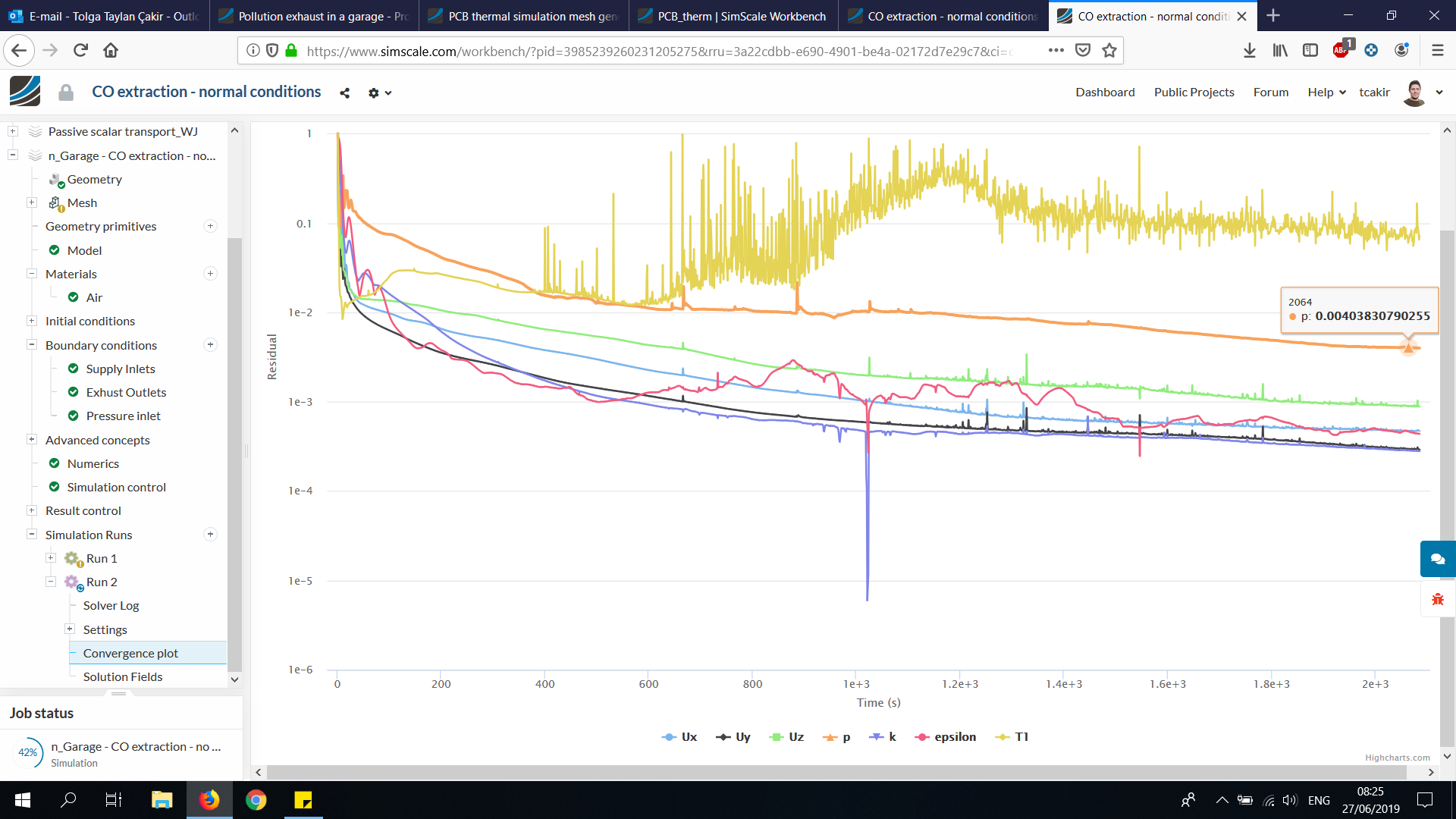 I calculated the required flow rate to dissipate the CO concentration to the allowed values (100 ppm) according to the available regulations in my country. I made a duplicate of the simulation above, uploaded the new geometry and managed to create the mesh successfully, I double checked all the parameters in the new simulation to be exactly like in the one above, then tried to run the simulation but unfortunately, something went wrong and the simulation it’s crashing around 5%.