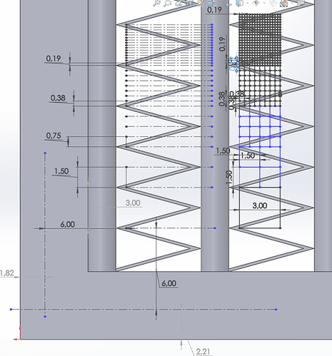 At 6mm away from the first fin meeting point is where i will put the new (0,0) origin for the bounding box. With this i can be sure that the edges of the cells meet up with the geometry as shown on the right side of the CAD picture. I mapped out the cell size for each level also.
