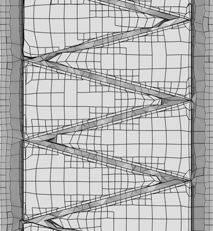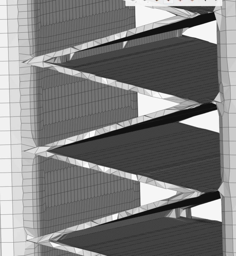 So i upped the fin edges to level 8. This helped significantly with the edge quality. However this larger view somewhat confirms my “edge between cells lining up with the geometry snap point” theory. Every other row where the fins meet has a worse snapping mesh. I think your geometry movement will help with this.