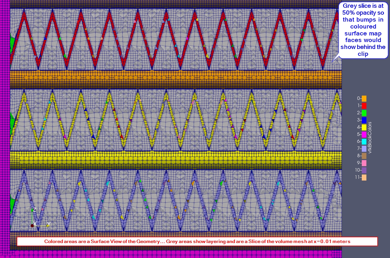 Here is a 90% layered mesh will ALL the inside corner issues resolved using a smaller CAD file section of my ‘snapped to Level 6 grid’ geometry and here is a ParaView image which shows the 90% layering in the Grey slice (at x=0.01m at 50% opacity) and it shows that all the inside corner crap is gone by looking at this parallel projection of the Colored Surface Grid: