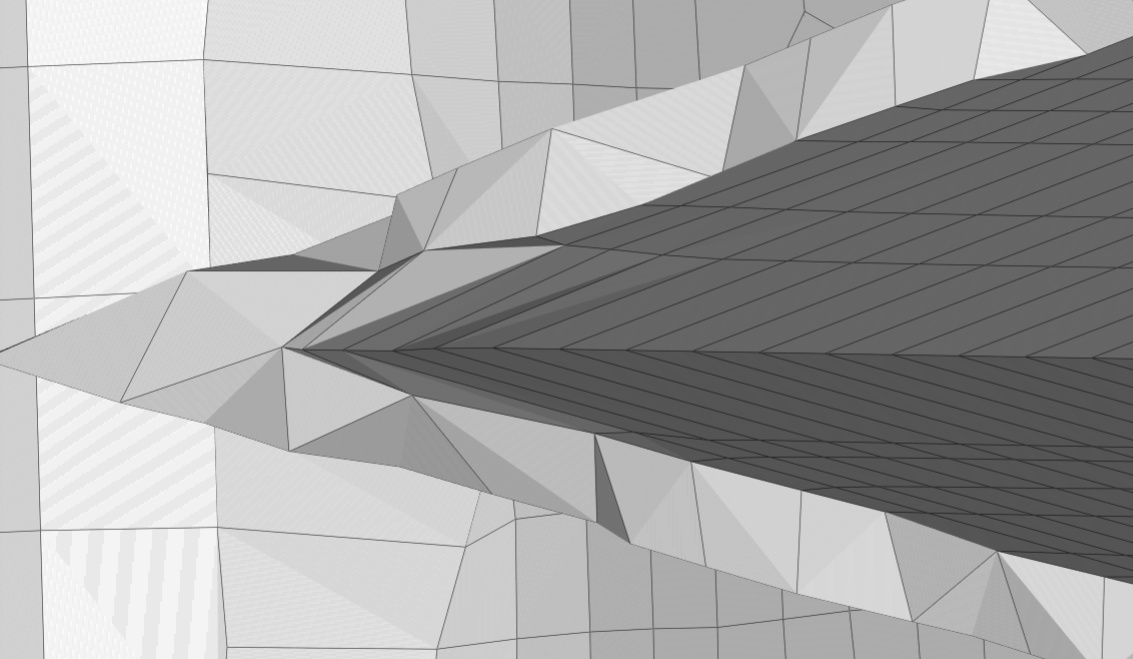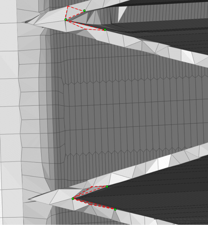 This zoomed in picture shows where the edges of the fins create cells. I have these faces at level 7 - this current cell size (0.000234575m) for this face is not what it should be because this face is 0.0002m thick. due to the cell size being larger then the geometry, we now have this… jagged, unequal sized triangles and unequal sized squares smushed to fit this face. This made me realize that the verticies created by these unequal cells might be the problem . All neon green dots are the cell nodes. The bottom fin snapped to the geometry how i want it to. It can be seen that the bottom fin meeting point has stretched cells on the small fin edge that ALLOW THE SURFACE MESH TO SNAP TO THESE POINTS.