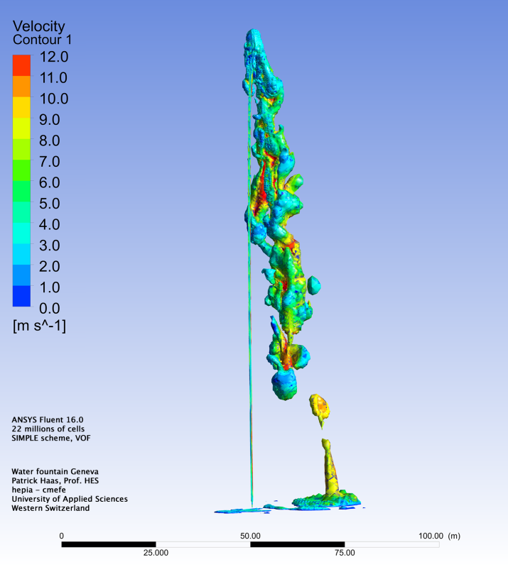 I want to determinate the shape and the height of a fountain jet with a certain nozzle at a certain flow (like the simulation below made with ANSYS Fluent).