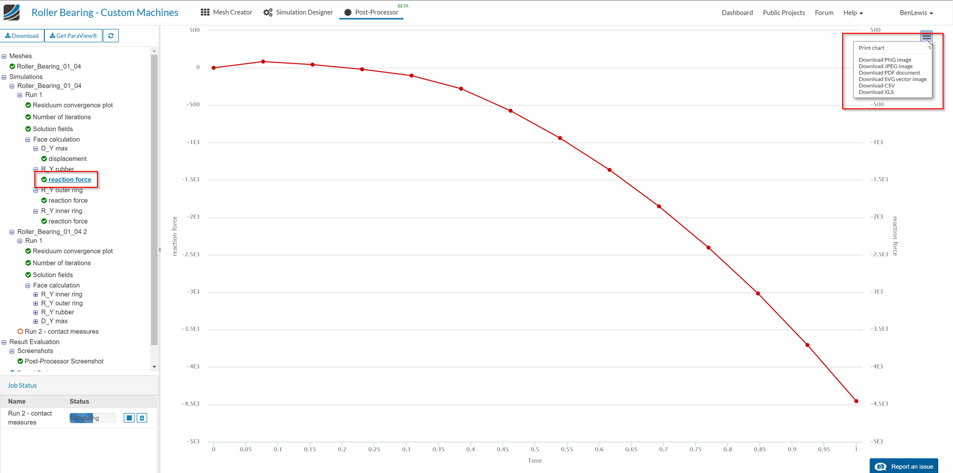 I have an issue when getting the nodal forces in ParaView. I select a contact pair with the “extract block” filter (slave and master separeted one by one) and I select the points using the “Select Points Through”, after it I choose the “SpreadSheet View” and the “Show only Selected Elements” option. Then I save the table with the “Export Scene” button and from excel I extract and summarize the nodal forces in Y direction (this direction is interesting). But I see different force sum values at the master and at the slave side. Further on, the stress what I see in the homogeneous stress distribution zone is OK, exactly the value what I expect! But this stress can not be reproduced when I whant to calculate it back analytically from the reaction forces. Both of the reaction force sums (master and slave) should result in much smaller stress in the bolt (keep in minde, that I get different values at the master and slave side).